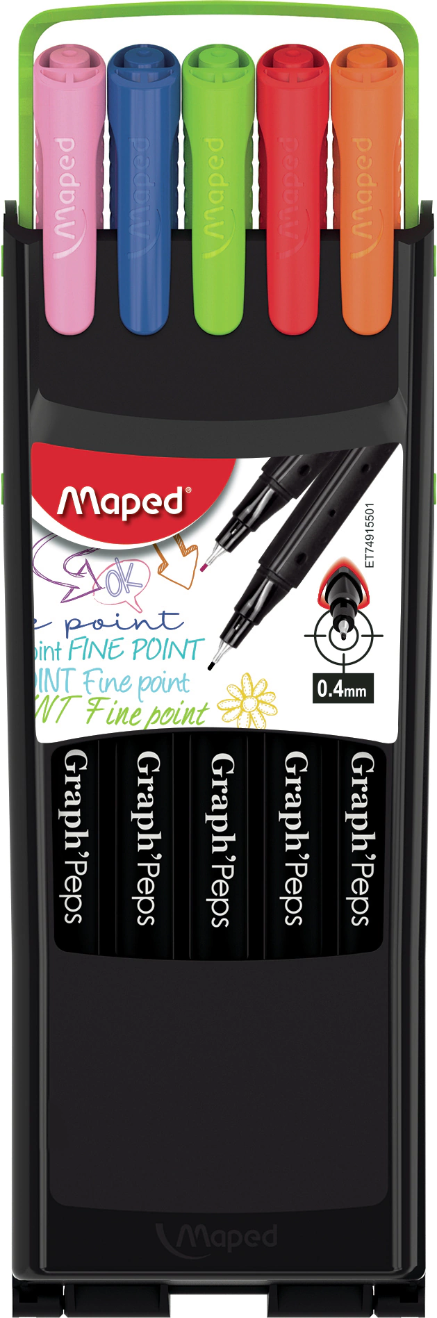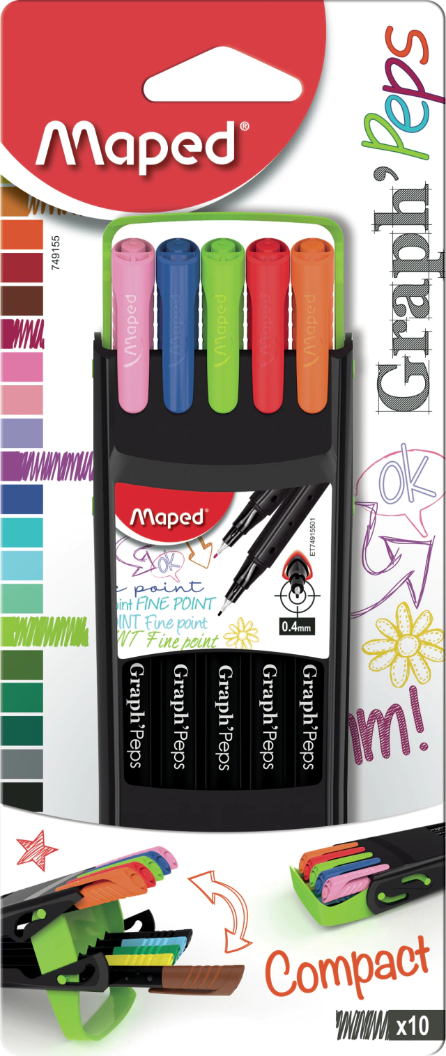 Las microfibras Maped Graph’Peps son ideales para quienes quieran embellecer su escritura, dibujar con precisión... ¡ O sencillamente dar rienda suelta a su inspiración! Vienen en distintas presentaciones. Amplia gama de vibrantes y brillantes colores.